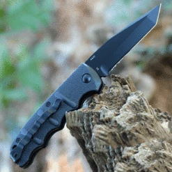 The 440 stainless steel blade was conceived in the shape of a modified drop point.