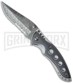 This Attractive folding knife with a high tech appearance. The 440 stainless steel blade features a unique Snowflake Damascus pattern and gray anodized aluminum handles.