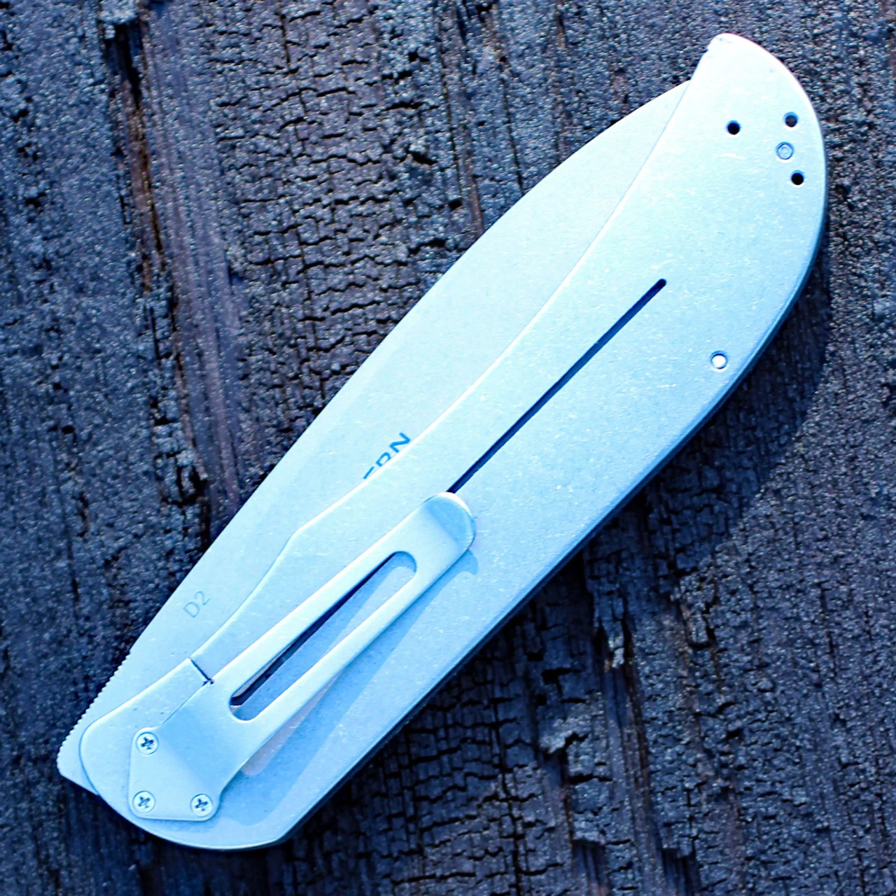 The Boker Plus Exskelibur by South African designer Mike Skellern has been a fixture in our collection for years. Several variations have been released. The titanium framelocks are particularly popular thanks to their flat design. Since these knives consist of premium materials and are thus priced at the upper end of the scale, we have developed a version that replaces the titanium with a stainless steel framelock, while retaining the same flat design. The front scale is a self-supporting G-10 scale. The handle and the flat-ground D2 blade have a practical stonewash finish suitable for everyday use. The Exskelibur Framelock Steel is a true utility knife. With a repositionable clip (tip-up/r).
