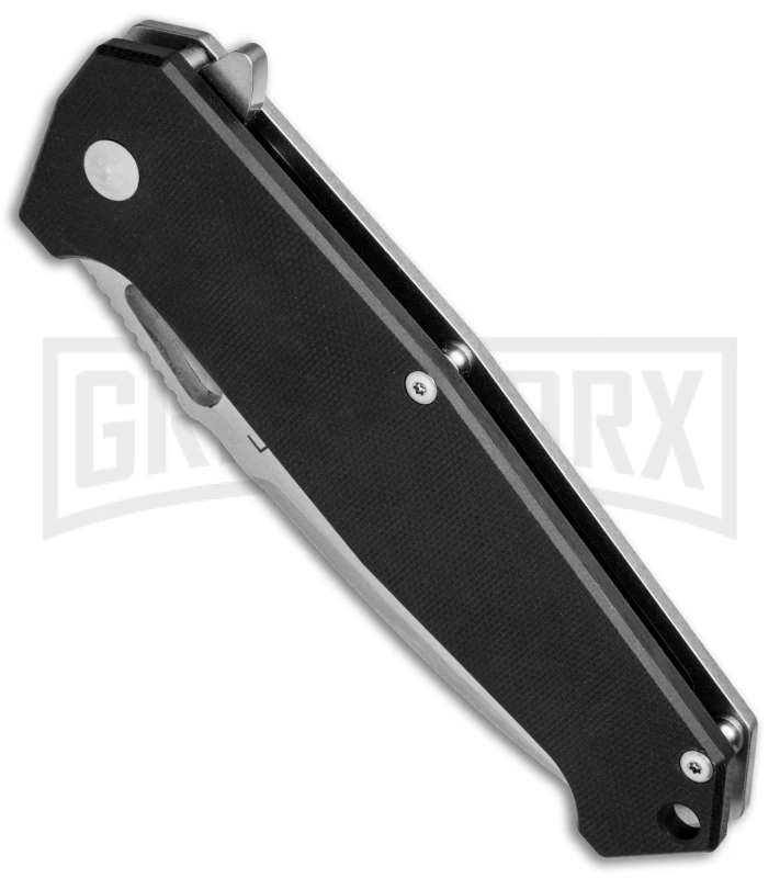 This Hitman model features a stainless steel frame lock handle with a textured black G-10 front scale and a stonewashed blade.