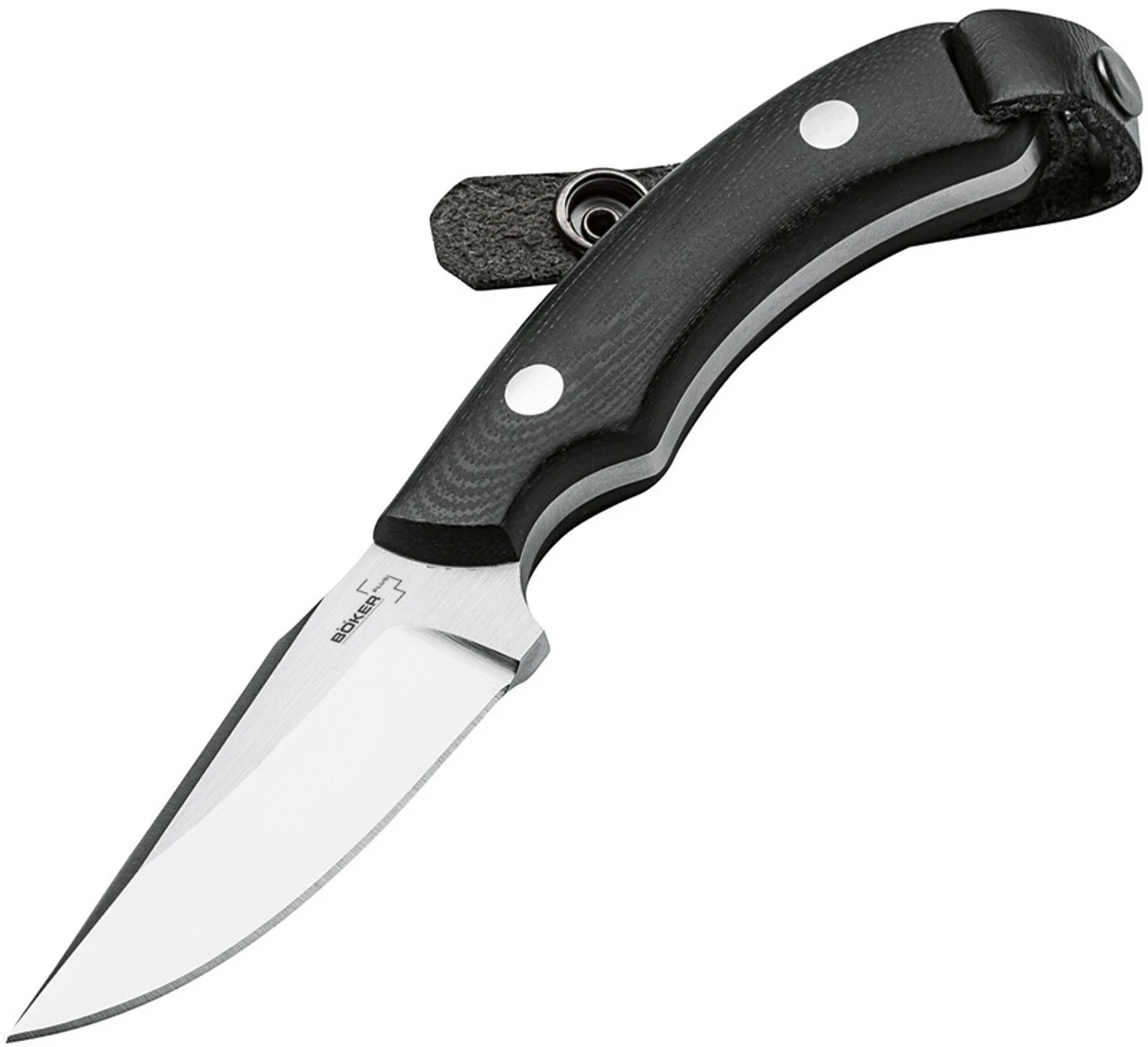 Designed by Greg Dash, the Boker Plus J-Bite is an extremely compact EDC knife that is worn horizontally on the belt and is also ideal for hunting or outdoor activities. The American knifemaker from New York has been enthusiastic about knives since his early youth and is always looking for practical innovations and improvements. The handy J-Bite is equipped with a satin-finished Clip Point blade made of 440C with a decorative ricasso. The handle made of black G10 fits comfortably in the hand despite its small size. To secure the knife in the horizontal carrying position, the designer developed the so-called J-Lock. A catch strap at the end of the handle is attached to the black leather sheath and prevents the knife from slipping out unintentionally.