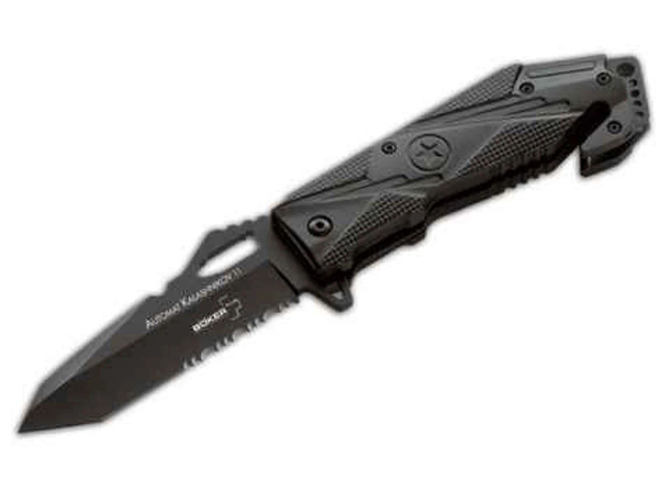 This impressive tactical knife, the newest addition to our Kalashnikov family, is a massively built pocket knife with a powerful tanto style blade. The sturdy handle, with its textured aluminum shell, fits perfectly in the hand and provides a secure grip in any situation. The blade is black coated, high performance 440C stainless steel. Also featuers a seatbelt cutter for added functionality.